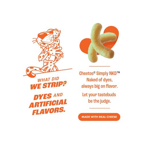 Introducing Simply NKD. What did we strip? Dyes and artificial flavors. Cheetos Simply NKD are naked of dyes, always big on flavor. Let your tastebuds be the judge. Cheetos snacks are the much-loved cheesy treats that are fun for everyone! You just can’t eat a Cheetos snack without licking the signature “cheetle” off your fingertips. And wherever the Cheetos brand and CHESTER CHEETAH® go, cheesy smiles are sure to follow.