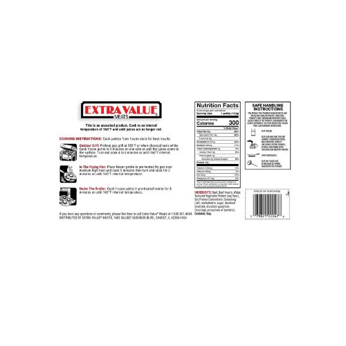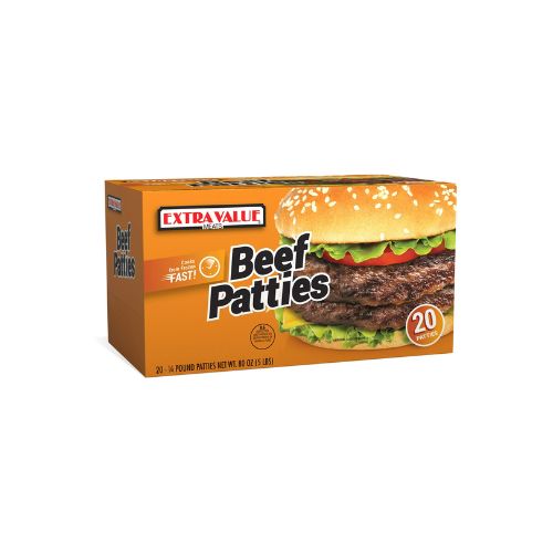 Extra Value Meats Quarter Pound Beef Patties are ready to cook and make a quick and easy meal. They are individually quick frozen and pre-shaped 1/4 pound patties, so they require minimal preparation. Our Extra Value Beef Patties cook from frozen fast on your grill, pan, electric skillet, or broiler! Try these burgers on your favorite bun with lettuce, tomatoes, onions, and pickles. No thawing is required before cooking (cook from frozen). Pick up a 5 pound Extra Value Beef Patties box and you are ready for your next cookout. The 20 count value pack patties are perfect for feeding families. Our Extra Value Meats are perfect for those times when cost is a consideration, but you still want great value. Dairy-Free. Keep frozen.