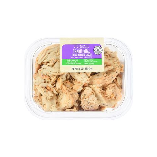 Enjoy an effortless dinner with this Freshness Guaranteed Traditional Pulled Rotisserie Chicken. It’s a convenient way to make meals simpler and healthier, even when you don’t have time to cook from scratch. Shredded, fully cooked chicken breast is the perfect base for quick and easy meals. Enjoy it hot and mixed with BBQ sauce to top a baked potato, mix up a cold chicken salad sandwich or wrap, add it to soup, or toss with some pasta and sauce for a simple, no-fuss dinner that’s ready in a snap! Heat in the microwave, in the oven, or in a skillet for a fresh, delicious meal. This item comes with 5 servings per container, and 18 g of protein per serving, 3 oz serving size, no artificial ingredients, flavors or colors, and is gluten free! Pick up some Freshness Guaranteed Traditional Pulled Rotisserie Chicken to have on hand for dinner in a dash!Freshness Guaranteed provides you and your family with high-quality fresh food that saves you time and money, many of which are cooked fresh or prepared in stores. Convenient solutions with value added in every Freshness Guaranteed item.