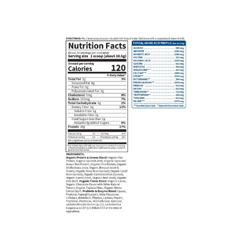 We combined the power of clean organic protein and the nutrient-rich energy of organic greens! Protein + Greens are CLEAN – Certified USDA Organic and Non-GMO Project Verified – and we think that CLEAN tastes better! Protein + Greens offers 20 grams of smooth organic plant protein per serving from organic sprouted brown rice, organic peas, organic chia, organic navy beans, organic lentil beans, organic garbanzo beans, organic greens, and veggies – organic alfalfa grass juice, organic spinach, organic kale, organic broccoli, carrots and beets – 1.5 billion CFU probiotics, non-GMO enzymes, 3 grams of organic fiber and less than 1 gram of naturally occurring sugar. Protein + Greens is a delicious way to get your protein and greens in one serving. And it’s CLEAN, TRACEABLE and PURE.