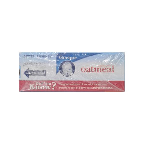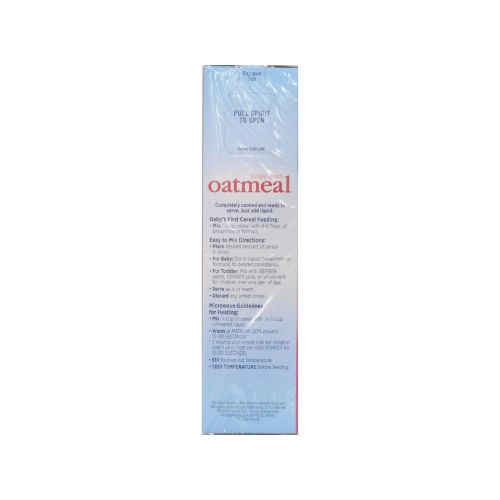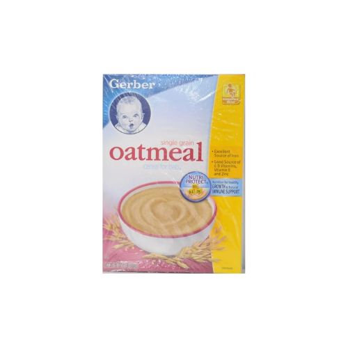 Cereal for Baby, Single Grain Oatmeal 16 oz (1 lb) 454 g Supported sitter. Nutri Protect: iron, B, E, zinc. Nutrition for healthy growth & natural immune support. Excellent source of iron. Good source of 6 B vitamins, vitamin E and zinc. Did you know? The good nutrition of iron-rich cereal is an important part of baby’s diet until the age of 2. Your child may be ready if she or he: sits with help or support; opens mouth and leans toward spoon. Good for Babies: Excellent source of iron for healthy brain development; 6 B vitamins for healthy growth; vitamin E and zinc for natural immune support; calcium for healthy bones and teeth. Made for Babies: Gentle introduction to solid foods (see preparation instructions for baby’s first cereal feeding); Fine texture that is easy to swallow; Single grains that are easy to digest; Try mixing with fruit and veggie purees for added variety and texture. Did you know? Iron is important for healthy brain development. Around the middle of the first year, babies’ natural iron stores begin to diminish; Gerber infant cereals provide iron, an important nutrient for your baby’s growth and mental development. No added refined sugar, artificial flavors or color. Completely cooked and ready to serve. Just add liquid. Baby’s First Cereal Feeding: Mix 1 tbsp. cereal with 4-5 tbsp. of breastmilk or formula. Easy to Mix Directions: Place desired amount of cereal in bowl. For Baby: Stir in liquid (breastmilk or formula) to desired consistency. For Toddler: Mix with water, juice, or whole milk for children over one year of age. Serve as is or warm. Discard any unfed cereal. Microwave Guidelines for Heating: Mix 1/4 cup of cereal with 1/4-1/2 cup unheated liquid. Warm at Medium (50% power) 15-30 seconds. If mixing with whole milk for children over 1 year, heat on High power for 15-20 seconds. Stir to even out temperature. Test temperature before feeding. 16 oz (1 lb) 454 g Fremont, MI 49413 800-4-GERBER 2009 Nestle