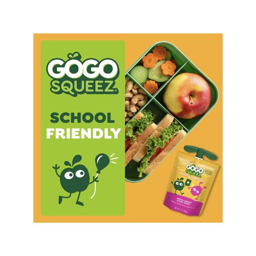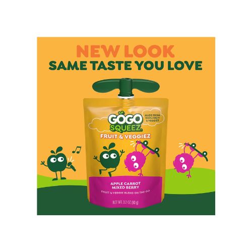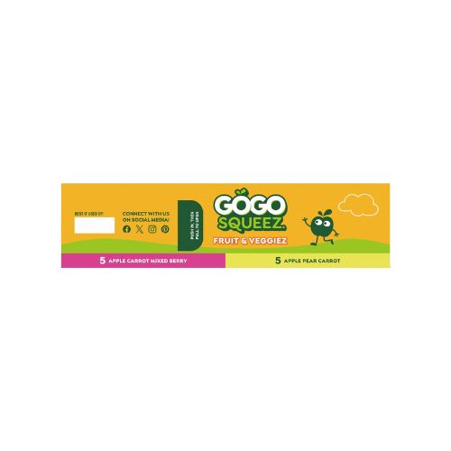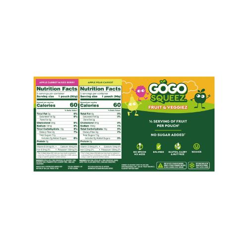 SqueeZ out the best with GoGo squeeZ Fruit and VeggieZ! These Fruit and Veggie Blend On the Go pouches are delicious snacks made from 100% fruit and veggies. Each pouch is simply yummy with no sugar added* and contains ½ serving of fruit, ensuring your family gets the good stuff. These fruit and veggie snacks for adults and kids are gluten-free, dairy-free, nut-free, kosher, Non-GMO Project Verified, and BPA-free. Great for kids snacks, school snacks, snack bags, or office snacks, these individually wrapped snacks fit into any snack box or lunch box. Recycle empty pouches with TerraCycle®. Discover even more to squeeze with GoGo squeeZ Fruit, GoGo squeeZ YogurtZ and GoGo squeeZ PuddingZ snack packs. *Not a low calorie food. See Nutrition Information for sugar and calorie content. The USDA considers ½ cup of fruit a serving. **Participation is limited.