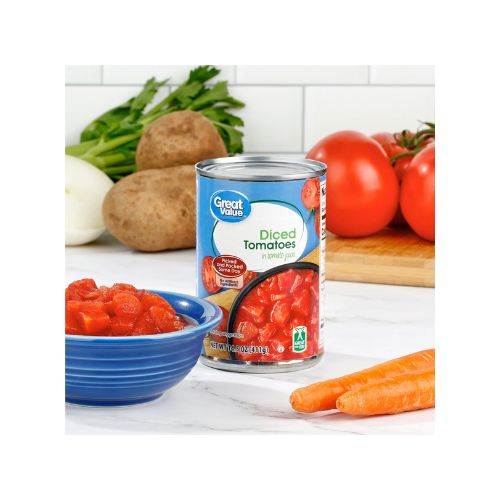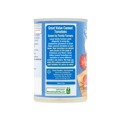 Great Value Diced Tomatoes start in California’s Central Valley, where local family farmers work diligently to bring the wholesome goodness of California tomatoes to your home. Ripe tomatoes are picked and canned at the peak of freshness within five hours of harvest, steam peeled and soaked in tomato juice to preserve freshness and flavor. These diced tomatoes are great for a variety of recipes including pasta sauce, chili, soups, stews, casseroles, pizza, bruschetta, meatloaf, enchiladas, salsas and more. Our tomatoes are soaked in tomato juice and loaded inside a can that features an easy pull-tab for your convenience. Enjoy fresh from the farm taste with Great Value Diced Canned Tomatoes.