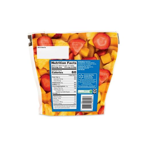 Great Value Mixed Fruit comes with a delicious blend of pineapple, sliced strawberries, mango, and peaches. This fruit mix is ideal for making homemade smoothies. You can serve up this fruit mix plain or top with whipped cream. You can also add to fruit salads, ice cream, yogurt, or milkshakes. For a special treat serve with cereal, pancakes, or waffles. The mixed fruit is also great as a topping on cheesecake and other dessert recipes. The frozen fruit offers nutritional benefits as they are a good source of dietary fiber and vitamin C. This mixed fruit comes in a reclosable bag to help maintain freshness. Add the refreshing taste of Great Value Fruit Mix to your day.