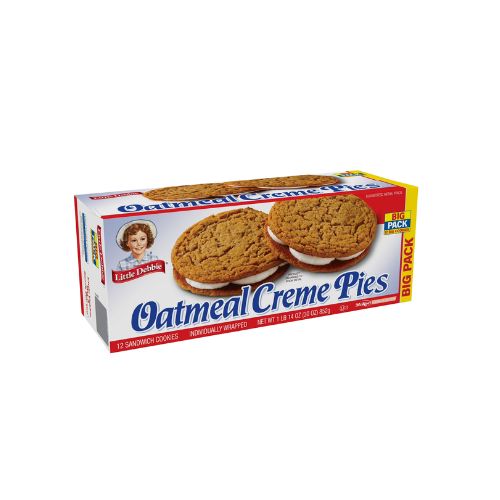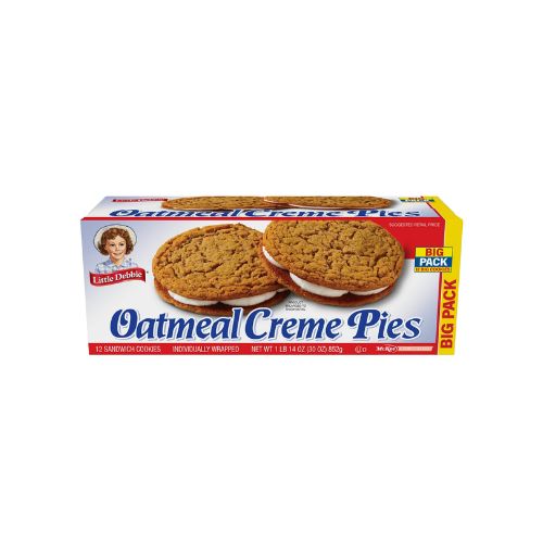 Give your taste buds a treat with Little Debbie Big Pack Oatmeal Creme Pies. Enjoy the classic flavor on the go. It comes with 12 individually wrapped pies. Each Little Debbie oatmeal creme pie has 330 calories per serving. They also come ready to eat. Little Debbie creme pies contain no trans fat and are free of cholesterol to meet your dietary needs.
