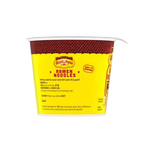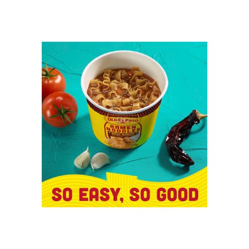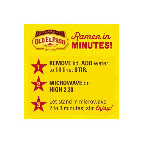 Bring the sizzle with Old El Paso Beef Birria Naturally Flavored Ramen Noodles. You get the perfect fusion of comforting ramen and bold Tex-Mex flavors in one easy to prepare cup of noodles. Whether you enjoy it as is or add your favorite toppings, this ramen is sure to satisfy your cravings with an irresistible blend of savory spices, tender noodles, and a mouthwatering broth. Ready in minutes, this ramen is perfect for busy weeknights, after school snacks, or a fast comfort food anytime. Simply remove the lid, add water to fill line, stir, and microwave on high following the directions on the package. Love to customize? Add chunks of beef, a squeeze of lime, or a dollop of sour cream. Whether you need a speedy part of lunch, a satisfying dinner side, or a late night snack, stock up on Old El Paso Ramen Noodles to always have great taste handy. Old El Paso has been stirring up smiles for generations. We make it easy to enjoy flavorful and convenient products including dinner kits, taco shells, tortillas, seasoning, sauces, and refried beans.