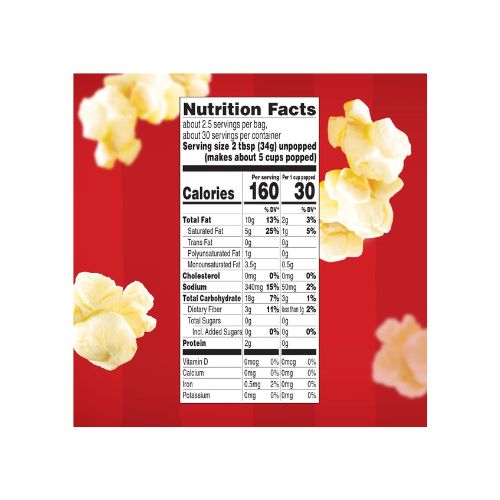 Orville Redenbacher’s Movie Theater Butter Popcorn is a delicious and premium microwave popcorn. The perfect balance of butter flavor and salt is great when you’re craving movie theater popcorn. It is light and fluffy, with a delicious crunch. Orville Redenbacher’s Movie Theater Butter Flavored Popcorn is made with 100% whole grain, gourmet popcorn kernels and can be enjoyed as gluten free snacks. Made with only 100% real ingredients from natural sources, this popcorn snack contains no artificial preservatives, no flavors and no dyes (colored with annatto). Ready in minutes, simply follow the directions on the microwavable popcorn bags for warm, freshly popped popcorn anytime cravings strive for delicious salty snacks. Can’t get enough popcorn? Explore Orville Redenbacher’s other microwave popcorn flavors, popcorn seasoning and kernels for a gourmet popcorn experience. Orville Redenbacher’s isn’t just a name, it’s a promise of excellence and authenticity.