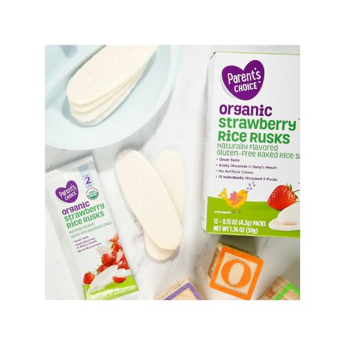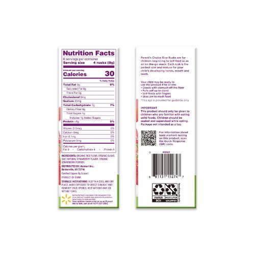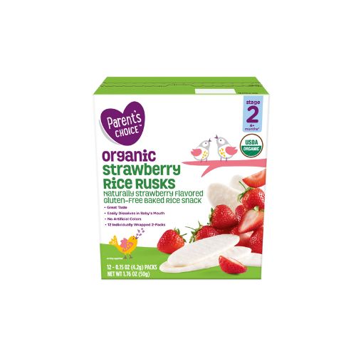 Parent’s Choice Organic Strawberry Rice Rusks, Stage 2, 6+ Months, are a delicious, handy snack for children who are beginning to feed themselves and for when the family is on the move. The strawberry-flavored rusks, which contain no artificial colors, not only taste great but also will dissolve easily in your little one’s mouth. These gluten-free organic snacks are designed to be the ideal size and texture for your child’s developing hands, mouth, and teeth. They are formulated for children who are 6 months and older. Each package comes with 12 individually wrapped packs of 2 rusks each, giving you a supply of a satisfying treat for your child when you’re at home or on the go. Parent’s Choice Organic Strawberry Rice Rusks, Stage 2, 6+ Months, are a great snack option for children who are learning to feed themselves. Since 1998, Walmart’s Parent’s Choice has been trusted by parents across the country to provide quality, affordable baby products. We offer a wide range of products including diapers, wipes, toiletries, baby food, formula and baby feeding products. With a quality guarantee to back up all its baby, toddler, infant and newborn products, Parent’s Choice takes care of your little one’s needs for less. Stage 2 6+ months. This age is provided for guidance only. Parent’s Choice Rice Rusks are for children beginning to self-feed or as an on-the-go snack. Each rusk is the perfect size and texture for your child’s developing hands, mouth and teeth. Your child may be ready to use this product if he or she: Crawls with stomach off the floor Pulls self up to stand Self-feeds with fingers Uses jaw to mash food