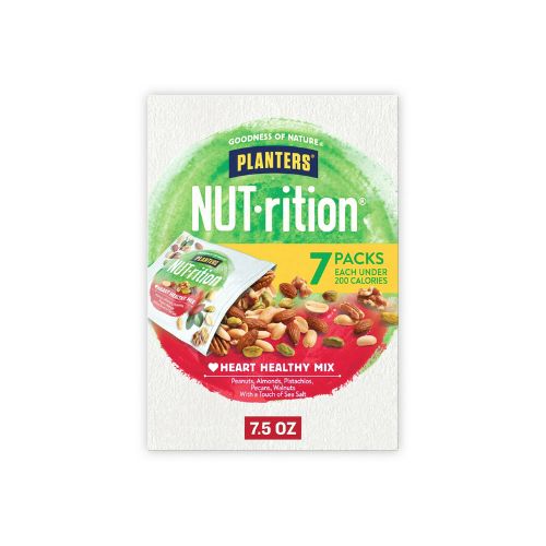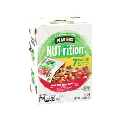 - Includes seven 1 oz plastic packages of PLANTERS NUT-RITION Heart Healthy Nut Mix, Mixed Nuts in a cardboard box
