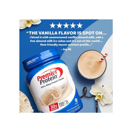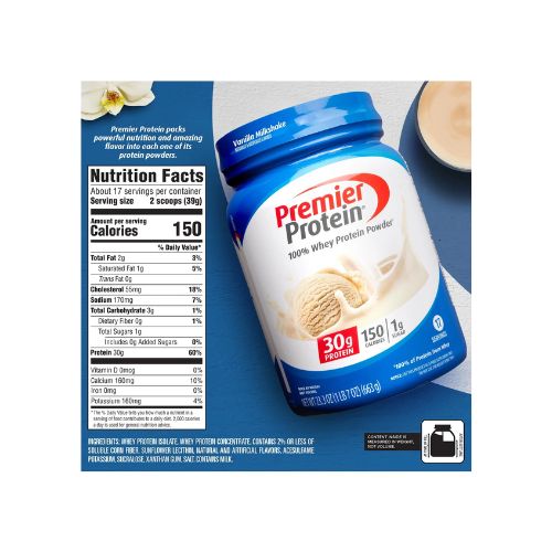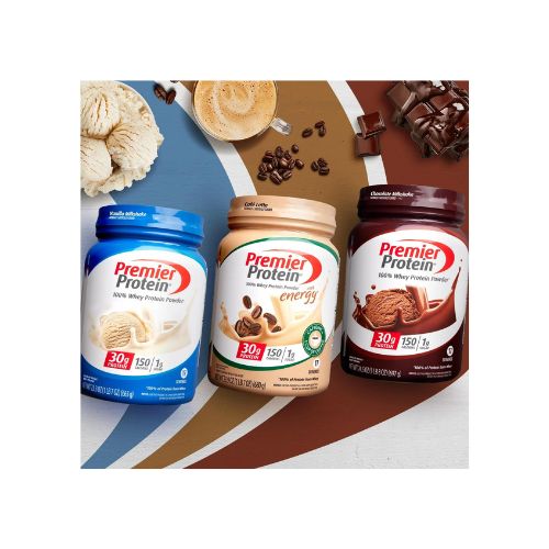 Enjoying something sweet and delicious shouldn’t mean you’ve lost track of your health and fitness goals. Premier Protein packs powerful nutrition and amazing flavor into each one of its protein powders. Each serving of Premier Protein Powder contains 30g protein, 150 calories, and 1g sugar. Gluten free & made with 100% protein from whey, it is perfect for use any time of the day, from breakfast to afternoon snack to post-exercise fuel. Try it mixed with water or milk, blended into your favorite smoothie recipe, or baked into protein packed recipes. Each canister contains 17 servings. Available in 3 delicious, indulgent flavors: Café Latte, Chocolate Milkshake and Vanilla Milkshake.