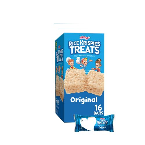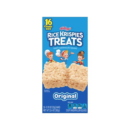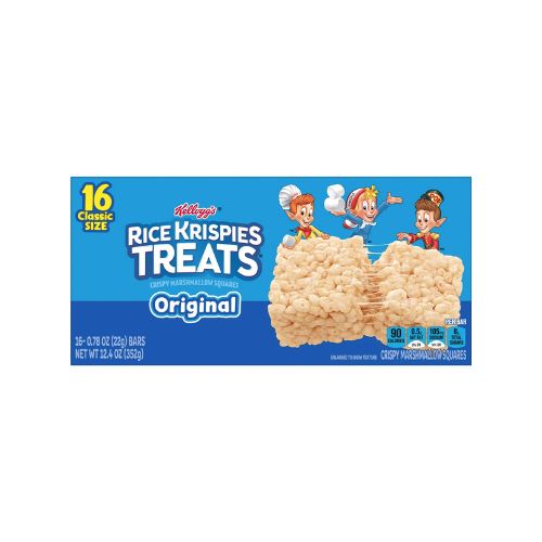Rice Krispies Treats Original marshmallow cereal bars, made with the taste of soft, gooey marshmallows and crisp rice cereal, are the perfect snacks for kids. These individually wrapped bars are ready-to-eat and ideal for school snacks, kids lunch, or snacks to go. Great for small hands and mom-approved, these bars are perfect for lunchtime, dessert, party snacks, or car snacks. Add them to treat boxes or snack bags for traveling. Rice Krispies Treats Marshmallow Snack Bars are also a fun addition to goodie bags, care packages, and camping snacks. Satisfy your sweet craving with the delicious flavor and on-the-go convenience of these individually wrapped bars. Whether for snack foods, variety snacks, or pantry snacks, these treats for kids are always a family favorite. CONTAINS MILK AND SOY INGREDIENTS. Shelf-Stable. Regular, Cardboard.Rice Krispies Treats Original Chewy Crispy Marshmallow Squares, Kids Snacks, 12.4 oz, 16 Count: