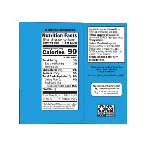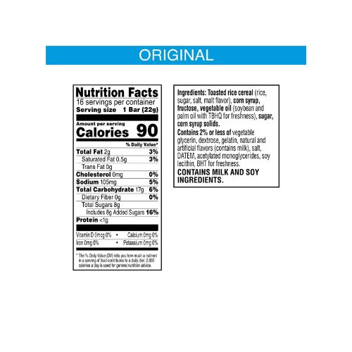 • Discover sweet flavor and crispy texture; 90 calories per bar; No high fructose corn syrup; Contains milk and soy ingredients​