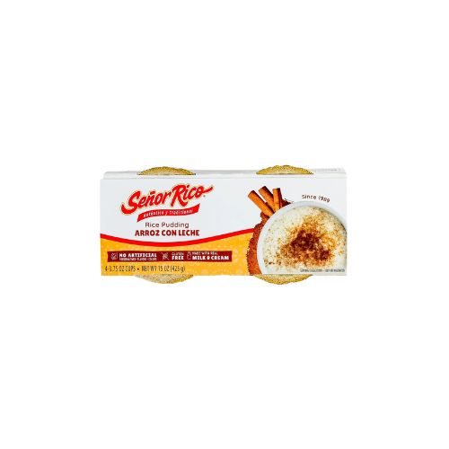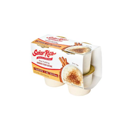 Senor Rico Rice Pudding is a Traditional Hispanic dessert called in Spanish arroz con leche alongside made with another other ingredients that complement the home-made flavor of authentic Rice Pudding. This Dessert is made with rice mixed with milk, sugar, cream, vanilla and other natural flavors in small kettle batches with whole milk and topped with cinnamon. Rich and Creamy delicately flavored dessert that will be a favorite on the family dinners. Senor Rico Rice Pudding cups come in a convenient 4 Count Plastic cup, easy to share and carry anywhere for a snack, lunch, or casual daily craving. Senor Rico Rice Pudding is a Gluten Free dessert. With only 130 calories per serving, Zero Trans Fat, this dessert is made from authentic recipes with the traditional flavors you know and love, enjoy Senor Rico Rice Pudding Dessert anytime! Contains Milk. Refrigerated.