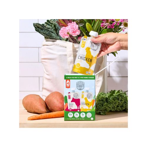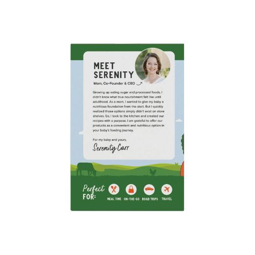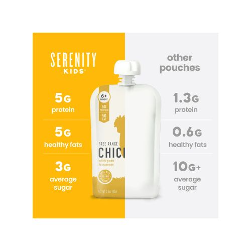 Serenity Kids Variety Pack includes 4 total baby food pouches: (2) Free Range Chicken with Organic Peas & Carrots and (2) Grass Fed Beef with Organic Sweet Potato & Kale. This variety pack is perfect for stocking up your pantry and on-the-go convenience! Our Free Range Chicken with Organic Peas & Carrots baby food is packed with nutrition and flavor because every bite counts! Why free range chicken? Because free-range chicken is humanely raised and tend to have a healthier and more natural diet resulting in better protein, vitamins, and minerals! Plus, we add additional healthy fats from olive oil to support your baby’s brain development. Our Grass-Fed Beef Baby Food Pouch with Organic Kale & Sweet Potato baby food is packed with nutrition and flavor because every bite counts! Why grass-fed beef? Because it is proven to be extra high in Omega-3s, iron, and conjugated linoleic acids (CLAs) which are essential for your baby’s growth and brain development! Plus our grass-fed organic baby food puree meat is sourced from farms that practice regenerative agriculture. With no added sugars or preservatives, our allergen-free, easy grab-and-go pouches are the most nutritious low sugar baby food with meat options for your little one.